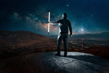 Man standing on the top of the mountain with LED tube Ultra Output