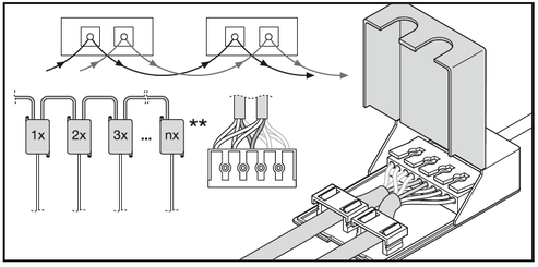 | Kytkentätapa | Jousiliitin, 5-napainen (L, N, PE, DA+, DA-) |