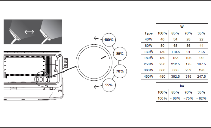 | Valovirta | 48000 lm / 40800 lm / 34100 lm / 27400 lm |