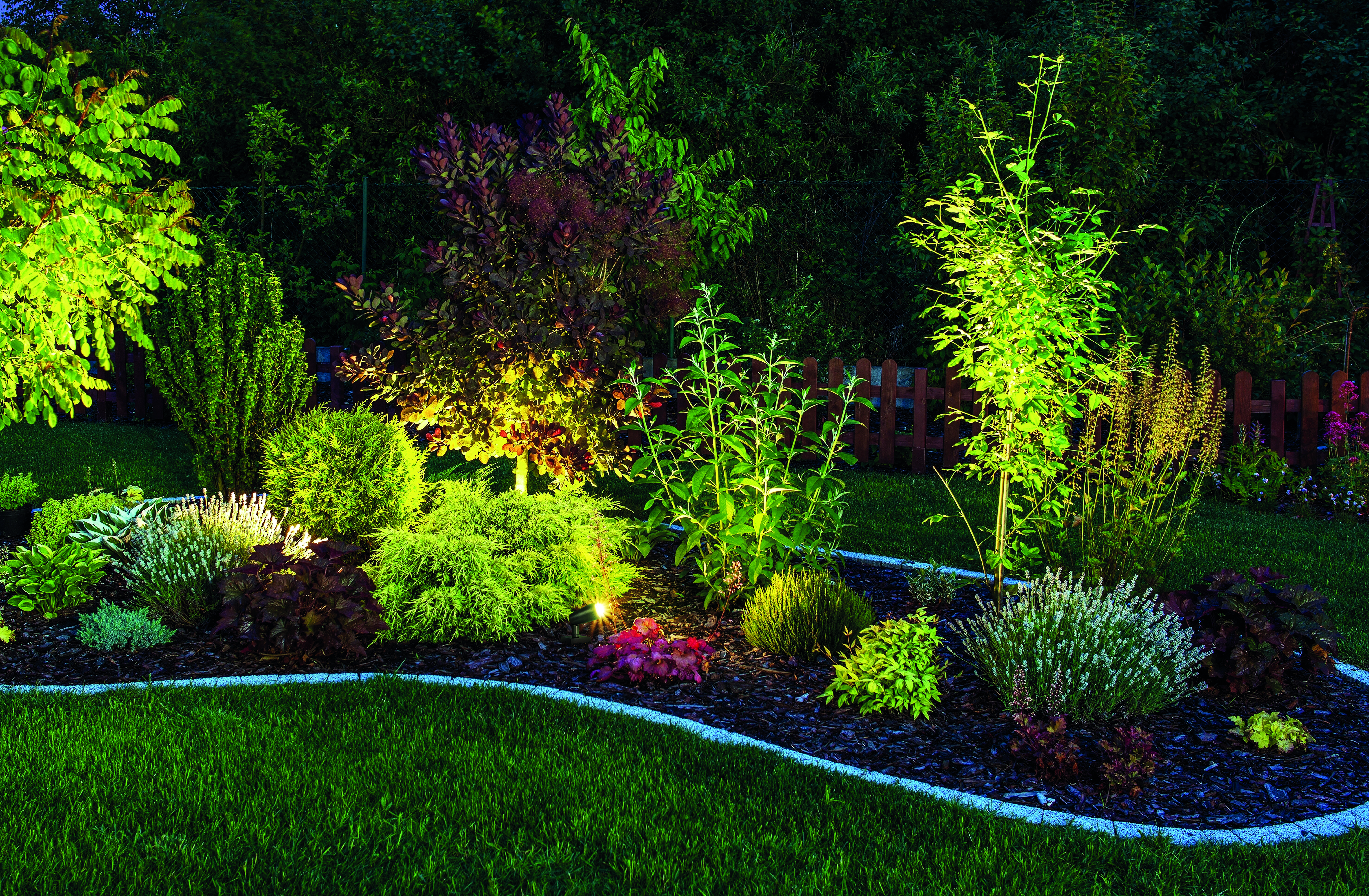 Luminous garden through LED lighting. Backyard garden at night, close-up