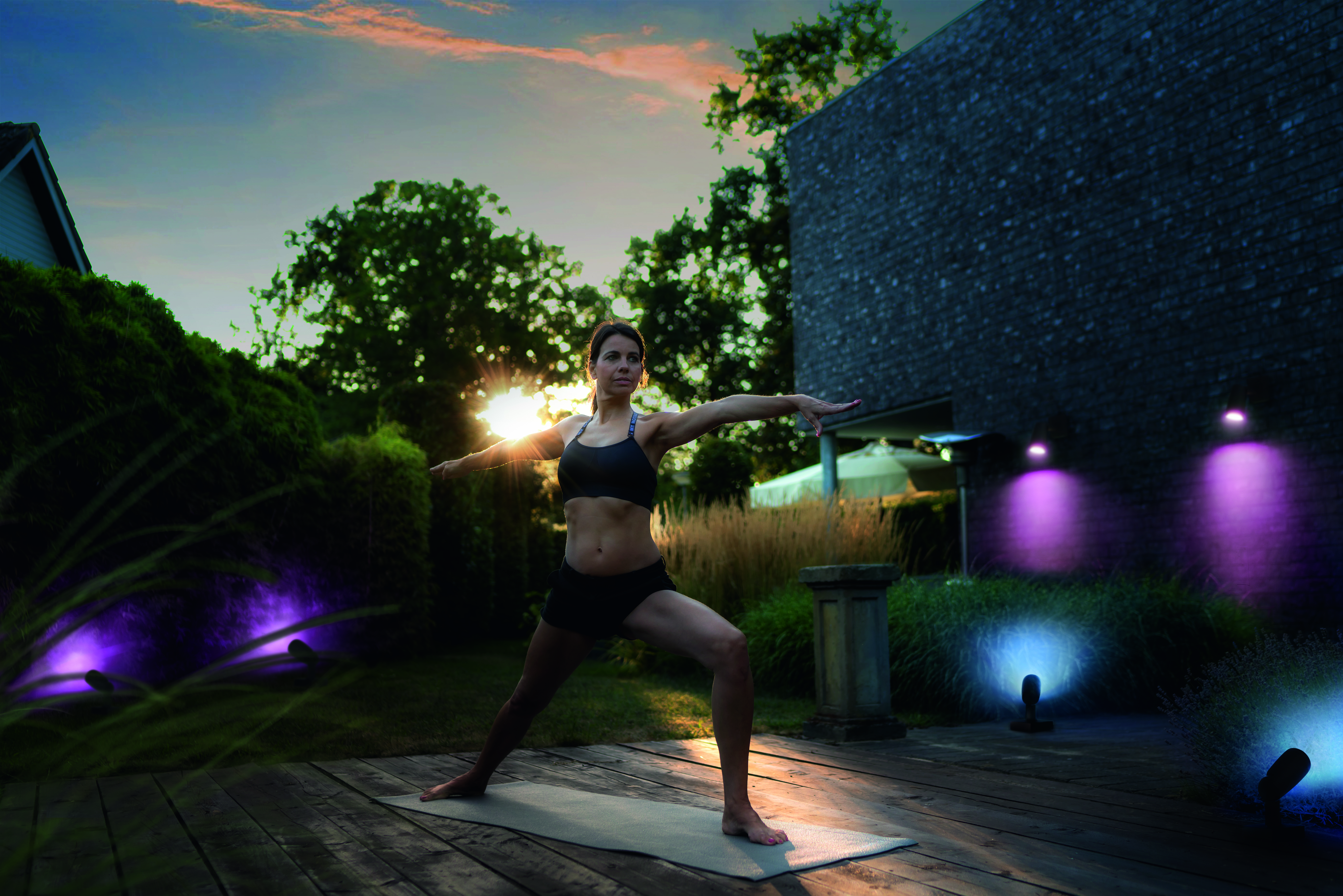 Woman practicing yoga in garden